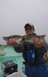 コメント: 今日は、どんよりと小雨混じりの天気でシチュエーションはバッチリでしたが今日の朝一はスロースタートで開始から船中のどこかしらでポツリポツリと釣れてひとまず皆さま型は見られましたがなかなか後が続かず、散発的なアタリばかりでした。
