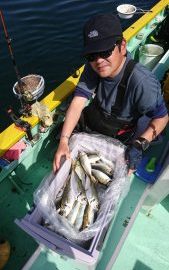 コメント:出船前に雨も風も落ち着いて、今日はベタ凪ぎでスタートとなりました。開始の1投目からお客さま4名さま全員ヒットで朝一のサービスタイムがスタートしました。