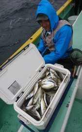 群れは行ったり来たりして落ち着きませんでしたが、雨空のお陰でアタリは続き、終了間際には入れ食いタイムも堪能して、レンタルタックルのお客さま4名さまもお土産は確保出来ました。トップのお客さまはダントツで2番手は65匹。