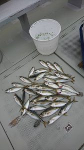 潮の流れは弱かったものの、すぐにポツポツとアタリが出始め、今日は20センチ前後のアジが主体にダブルも多く、好調にアタリが続きました。