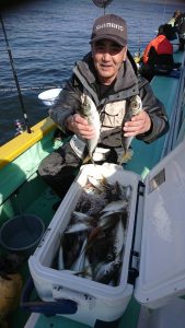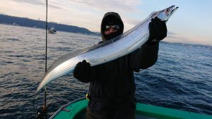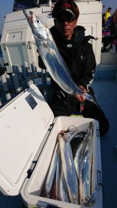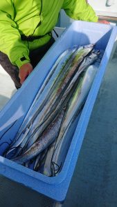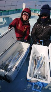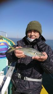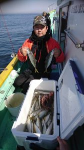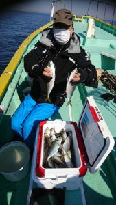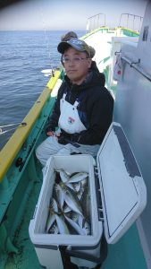 コメント: 今日は昨日の後半にアタリが続いたポイントまで一気に南下してからのスタートとなりました。今日も広範囲に反応が見られ、楽に釣りが出来る予想でしたが天気予報よりも早く北西風が強くなり海上は荒れ模様となってしまい早い時間帯から船酔いでダウンのお客さまが数名出てしまいました。アジの活性も極めて低い状況でアタリが出せるお客さまでもたまにアタリが出る程度の大苦戦でした。