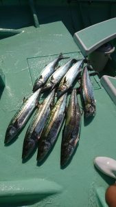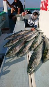 昼前からは広範囲に点々とナブラが たち始まり派手さは無かったのですが、ポツン、ポツンとサワラのヒットは出て、バラシもかなり目立ちましたが、お客様8名様で、4本キャッチは3人、3本キャッチはお2人で サワラをキャッチならずの方がお2人出てしまいましたが、船中合計は20本!。