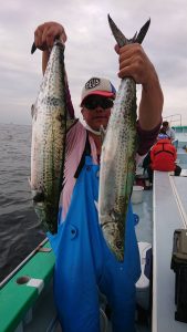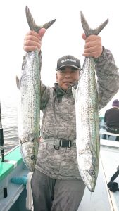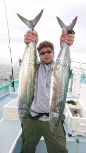 今日も早々にサワラはキャッチ出来ましたが、アタリは続かず 転々とポイント移動するもベイト反応は多く見られても今日はタチウオやイナダのまじりも無く厳しい状況でしたが、昼頃から大きくポイントを変えてからは鳥は忙しく飛び回り、イナダのボイルもそちらこちらで見られて、それまでテンション下がり気味だったお客様も 俄然やる気が入った様子で、リールの巻きも一段と速まりました!。